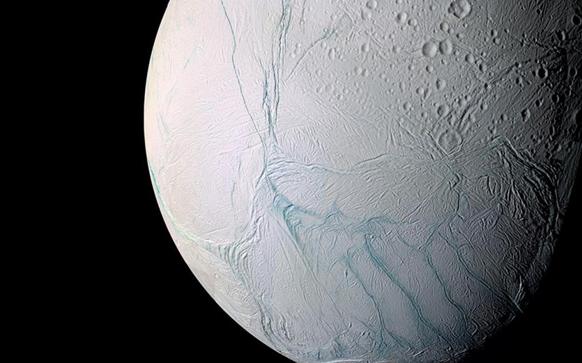 Discovered in August 1789 by British astronomer William Herschel (1739-1822), Enceladus is the sixth largest moon of Saturn. Although small, it is one of the most intriguing bodies in the solar system in regards for the search for liquid water and subsequently alien life. Enceladus can be described as almost a ‘love child’ of Jupiter’s Galilean moons Europa and Io- as it is an ice shell moon, very much like the former, but also possesses volcanoes which also grants it some similarity with Io. These volcanoes however, are not the same as those found on Io and indeed on Earth, they are in fact cryovolanoes- erupting not molten rock and metallic elements but instead icy water in vast plumes. This water falls as snow across the entire moon, making the surface a glistening white with a blueish tint, and causing Enceladus to have one of the highest albedo’s of any solar system body. These watery plumes were discovered in 2005 by NASA’s Cassini spacecraft, and were found to be emanating primarily from the southern hemisphere of the moon. Whilst much of the material from these cryovolcanoes falls back onto Enceladus as snow, a large amount is also jettisoned into space and actually forms Saturn’s E-Ring. The presence of these plumes is cited as very strong evidence that Enceladus, like Europa, has a vast underground ocean of liquid water- heated by a combination of tidal flexing from Saturn and radioactive decay deep in the moon’s rocky core.